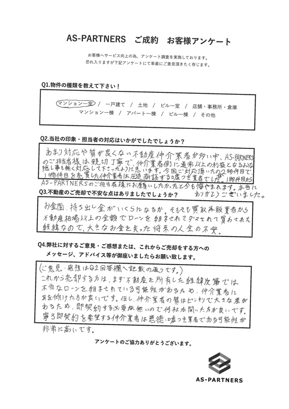 あまり対応や質が良くない不動産仲介業者が多い中、AS-PARTNERSのご担当者様は親切丁寧で、仲介業者側に通常以上の利益となるような隠し事も無く対応して下さったように思います。今回ご対応頂いたのは2物件目で1物件目を売買した仲介業者は圧迫商談する嘘つき業者でした。1物件目からAS-PARTNERSのご担当者様にお願いしたかったと今も悔やまれます。本当にありがとうございました。