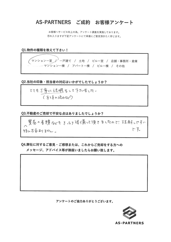 特に不安ありません。売買の書類などもきっちり準備して頂きましたので、理解しやすいです。
