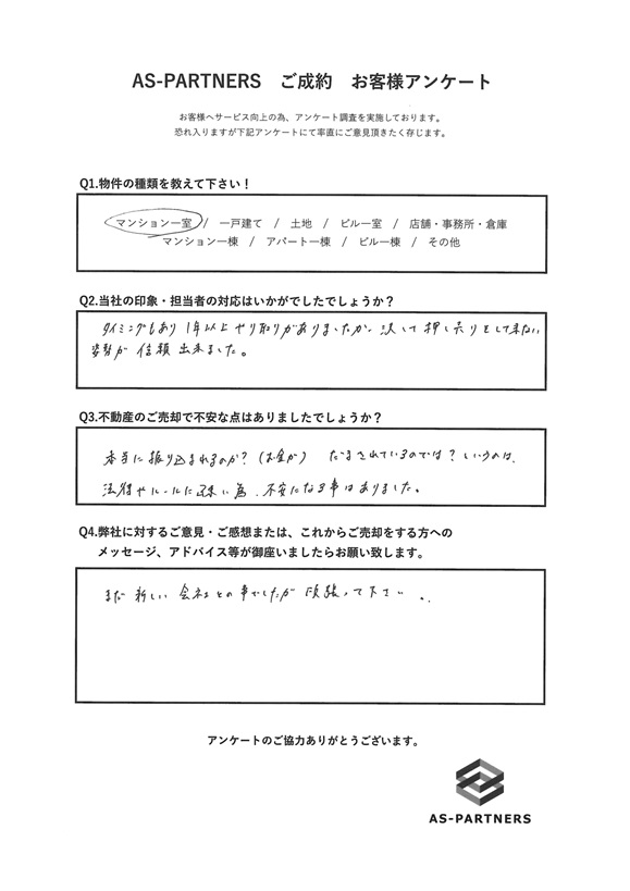 - 弊社に対するご意見・ご感想または、これからご売却をする方へのメッセージ、アドバイス等が御座いましたらお願い致します。