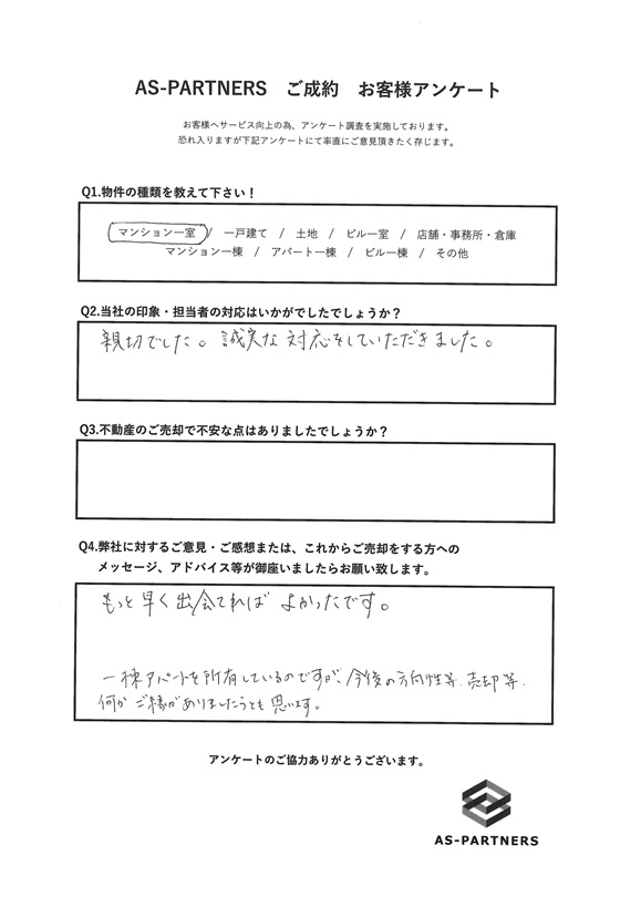 一棟アパートを所有しているのですが、今後の方向性等、売却等、何かご縁がありましたらとも思います。